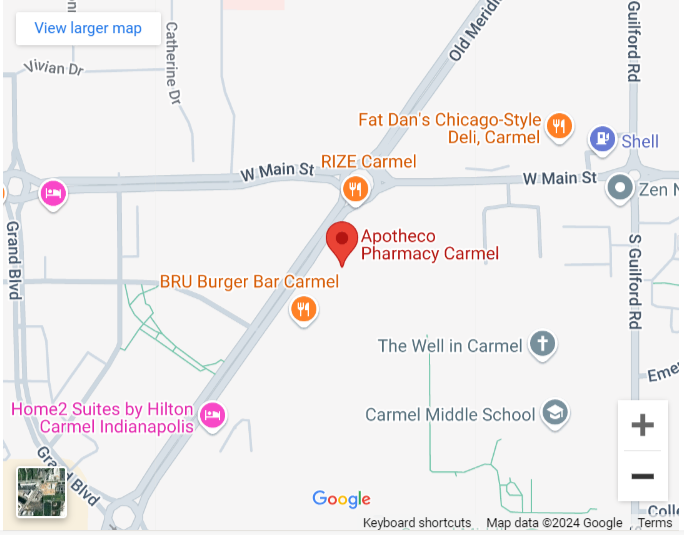 Apotheco Pharmacy is an innovative access platform that offers specialized dermatology care for those with skin conditions. We provide specialized treatment and care for Atopic Dermatitis, Acne, Actinic Keratosis, Wound Care, Fungal Infections, Psoriasis, and Rosacea. Apotheco Pharmacy Carmel was built from the ground up in 2020. We are located on Old Meridian street nestled amongst a bustling business scene that includes hotels, boutiques, restaurants, and bars. Our skin care and dermatology pharmacy in Carmel, Indiana is only a mile away from the Carmel arts and design district and ten minutes from the fashion mall at keystone. There is plenty of parking available on-site at our pharmacy, however free prescription delivery is available.