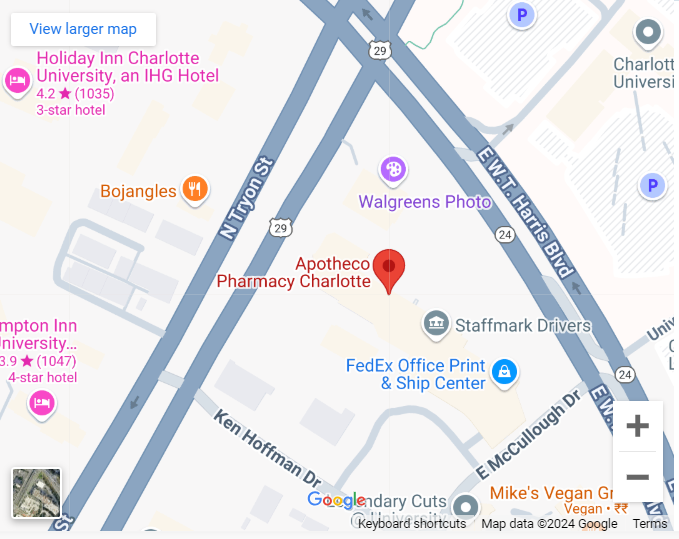 Apotheco Pharmacy Charlotte is a full-service pharmacy with a focus on skin conditions. We provide skin treatment for Atopic Dermatitis (Eczema), Acne, Actinic Keratosis, Wound Care, Fungal Infections, Psoriasis, and Rosacea. Stop by our store or choose to receive your medications through our white glove delivery service. We have plenty of parking available right on-site.