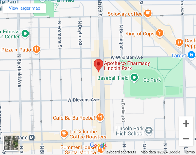 GK Drugs was acquired by Apotheco Pharmacy Group in 2020. We are located in the heart of Lincoln Park close to parks, Lake Michigan and the Lincoln Park zoo. As part of our services we can bring your medications to you free of charge or you can stop by and pick them up in person. While we are a full-service pharmacy, our specialty is Dermatology and are always fully stocked and ready to deliver.