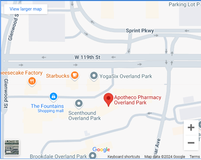 Family Pharmacy was acquired by Apotheco Pharmacy Group in 2023. Apotheco Pharmacy Overland Park is a a full-service pharmacy with a focus in skin conditions. We provide skin treatment for Atopic Dermatitis (Eczema), Acne, Actinic Keratosis, Wound Care, Fungal Infections, Psoriasis, and Rosacea. Our Overland Park pharmacy is located on The Fountains shopping Mall, Suite G5. We have plenty of parking available right on-site. Stop by our store or choose to receive your medications through our complementary free delivery.
